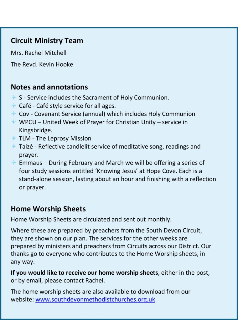 Alternatively, join us in acts of worship from home using service sheets prepared by preachers from across the Plymouth & Exeter District. These may be found and downloaded from our ‘Worship at home’ page.