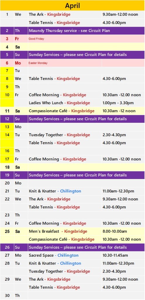 Click on the church name for details of regular events in Kingsbridge and Chillington.