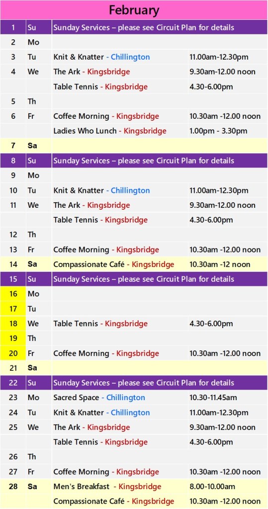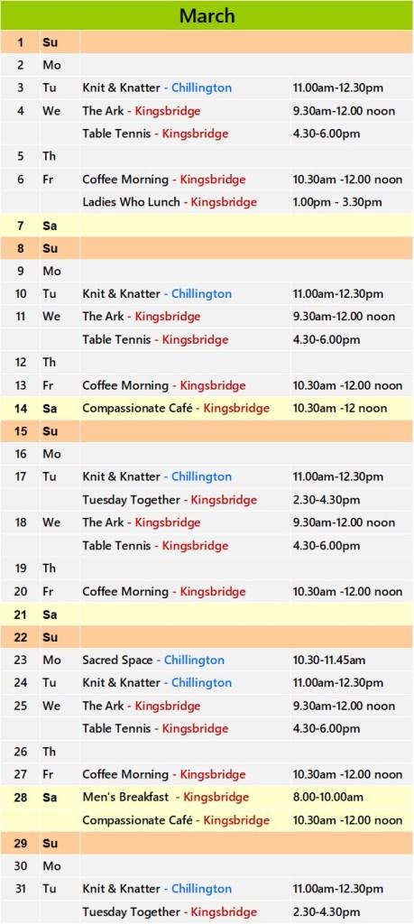 Click on the church name for details of regular events in Kingsbridge and Chillington.