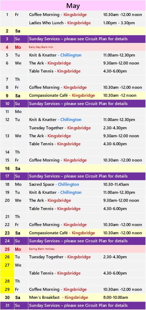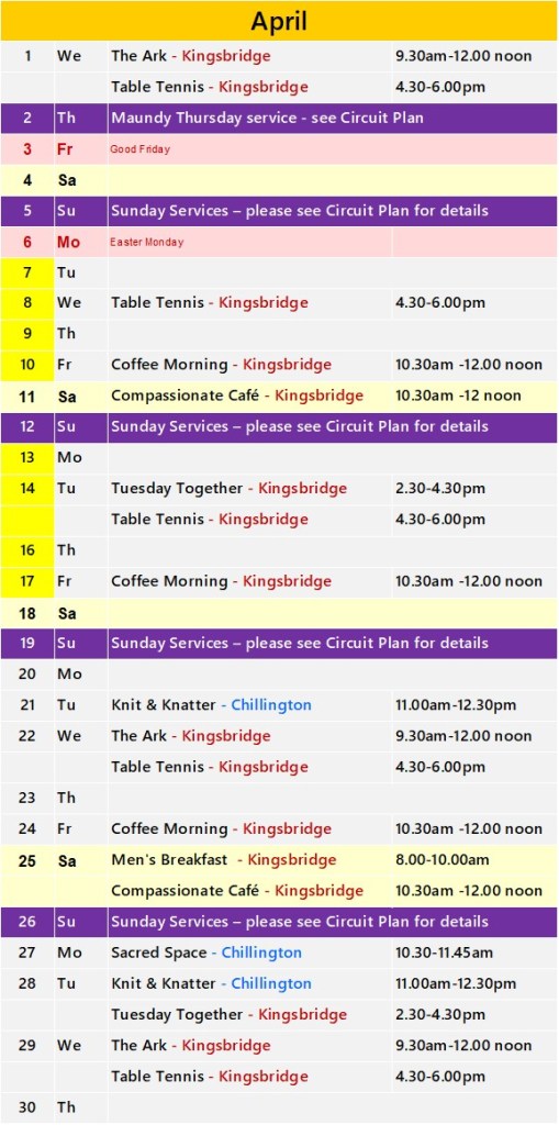 Click on the church name for details of regular events in Kingsbridge and Chillington.